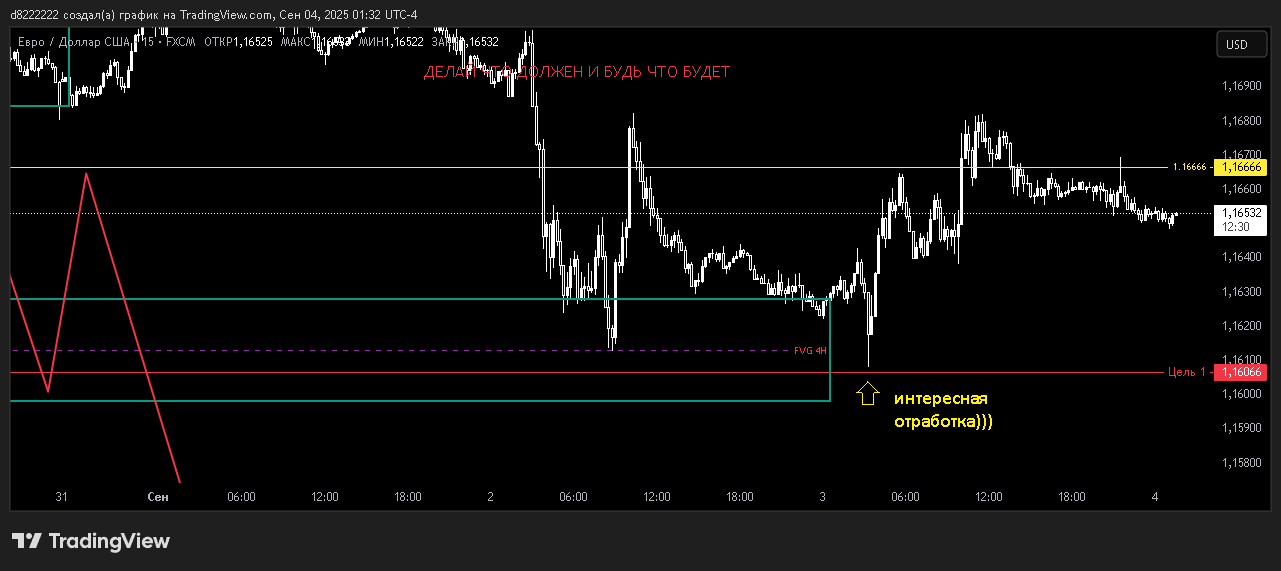 Digger Опубліковано 5 вересня, 2025 Опубліковано 5 вересня, 2025 (змінено) Прорыв уровня 1.1682 может привести к росту евро в район 1.1713 и 1.1740 и даже дальше к 1.1781 (при условии проблем на рынке труда США) Прорыв 1.1645 может привести к распродажам евро в район 1.1611 и 1.1576 Ожидаю нисходящего движения Возможно даже к 1.11 Змінено 5 вересня, 2025 користувачем Digger 4 1 Цитата