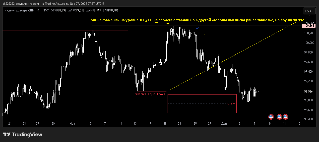 8222222 Опубліковано 7 грудня, 2025 Опубліковано 7 грудня, 2025 В 21.11.2025 в 04:49, 8222222 сказал: Хотел написать BOOM но еще рано хотя «импульсное движение» как по сценарию ))) Наблюдаем … одинаковые хаи на уровне 100.360 не спроста оставили но с другой стороны как писал ранее такие же, но лоу на 98.992 Заранее отвечаю на вопрос про чем тут индекс доллара в теме про евро …. Так вот, DXY обратно пропорционален другим валютам , то есть если доллар вверх то евро в низ всем Мира и добра и не ленитесь ставить реакции для обратной связи и мотивации рисовать графики и писать к ним комментарии ) Кто внимательно читает мои посты ….как видите в порядке написанного, сначала сначала сняли стопы на уровне 100 360 а затем аккуратненько пошли на уровень 98.992 теперь отрабатываем зону OTE 2 4 1 Цитата