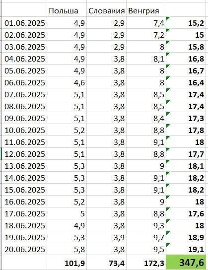 Аид Опубліковано 2 липня, 2025 Опубліковано 2 липня, 2025 3 часа назад, Аид сказал: Итого июнь 0,535 млрд кубометров из которых 2/3 из турецкого потока через Венгрию и Словакию. Июнь-июль-август-сентябрь-октябрь 1,3+0,5+0,5+0,5+0,5 теоретически 3,3 млрд. Своего капнет 3. Теоретически на грани. 3 3 Цитата