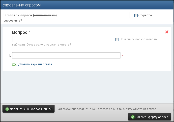 К ней прикрепляйте открытое/закрытое голосование (входите в "расширенная форма" и вверху "управление опросом")
