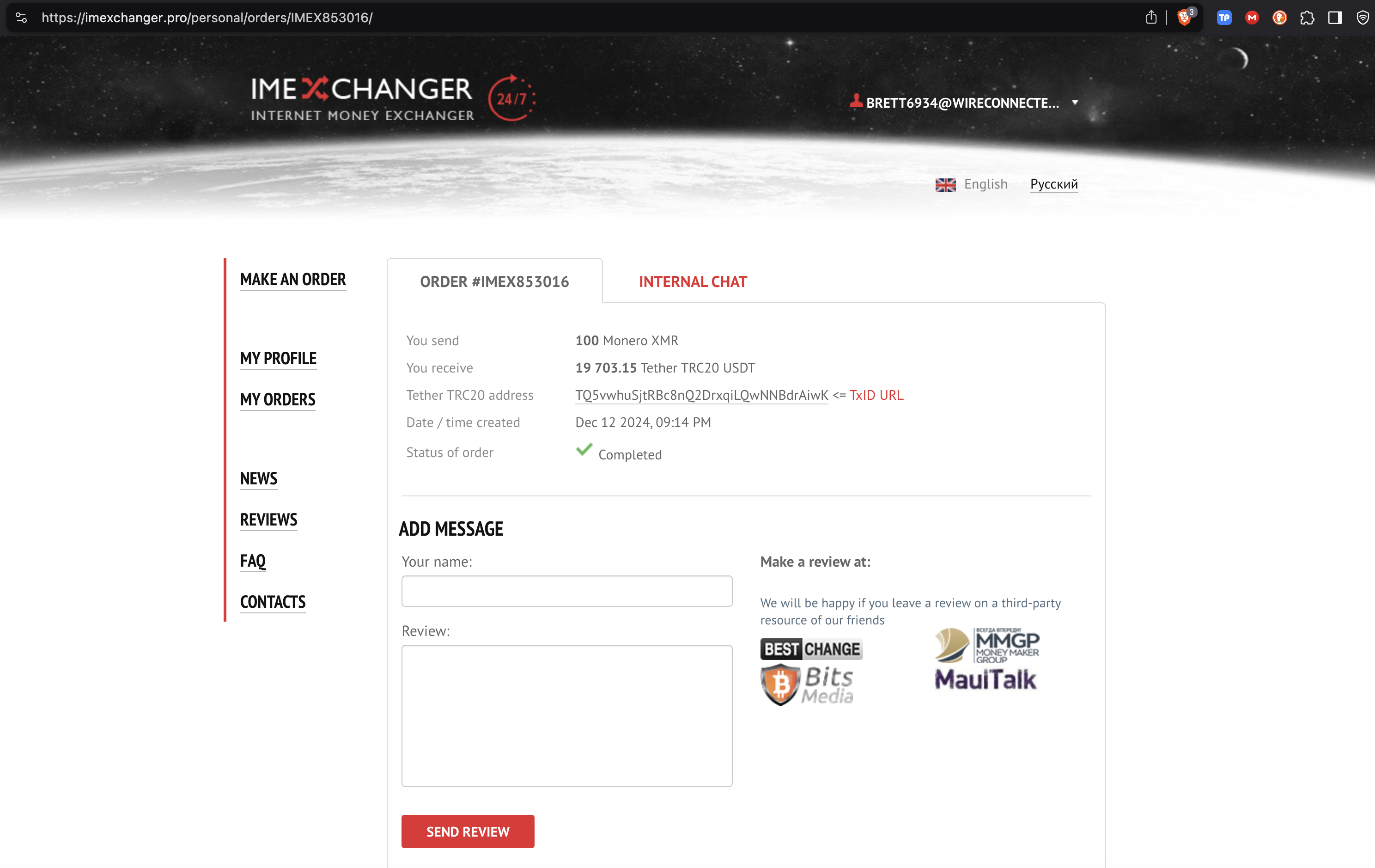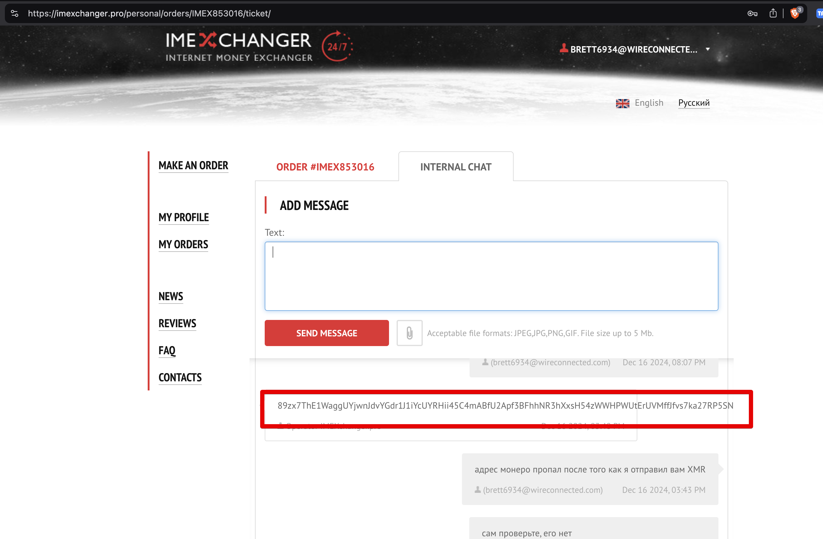 Гість СКАМ обменника Опубліковано 18 грудня, 2024 Опубліковано 18 грудня, 2024 Зарегистрировался тут так как попал в аналогичную ситуацию, но отправлял им Монеро Oбменик ImExchanger.pro отказывается делать возврат XMR на тот адрес откуда они пришли Причину блокировки они указали вот такую: "Вы Разбивали на несколько заявок" Кинули на 100 Monero XMR Заказал обмен на 100 Monero XMR 19703.15 Tether TRC20 USDT - до сих пор не получил order IMEX853016 Дата / время создания 12.12.2024 / 21:14 адрес обменника: 89zx7ThE1WaggUYjwnJdvYGdr1J1iYcUYRHii45C4mABfU2Apf3BFhhNR3hXxsH54zWWHPWUtErUVMffJfvs7ka27RP5SNB подтверждение платежа: https://xmrchain.net/tx/c353de3054d70d43822fef04b20593fbcefc75d6f021fcf527049c48c8a303d9 Скриншот https://ibb.co/88BcYp6 Начались танцы с бубном, удерживают мои деньги, возврат отказываются делать Возникает вопрос если другие обменивал BTC, которые можно проверить по всяким проверялкам, то каким образом это относится в Monero? с чего вы взяли что мои 100XMR Monero можно удерживать в заложниках!!!!!!!!!!! Предоставьте доказательства как вы называете "Отравленных активов" кто и как их отравил, и самое интересное чем? Цитата