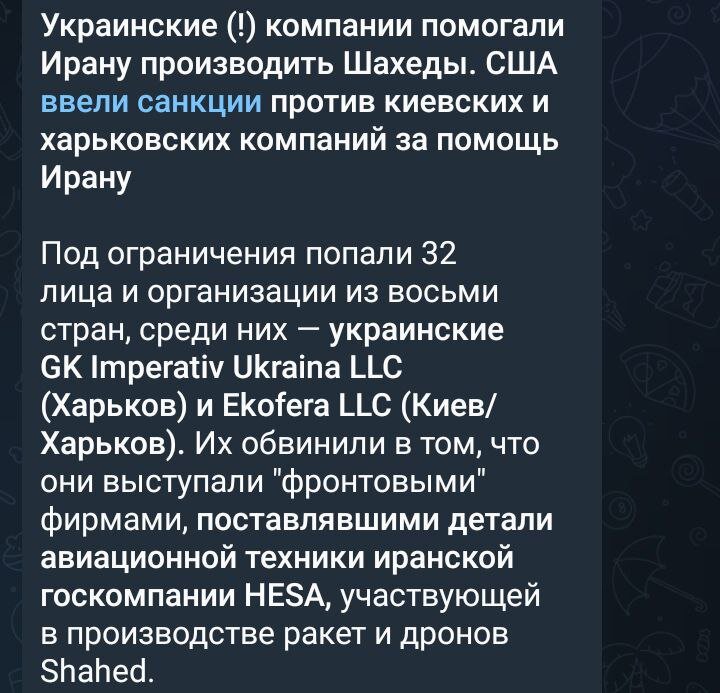 ZzzZzzZzz Опубліковано 14 листопада, 2025 Опубліковано 14 листопада, 2025 (змінено) 26 минут назад, Аид сказал: Министерство финансов США https://home.treasury.gov/news/press-releases/sb0313 Иранский агент по закупкам Бахрам Табиби (Табиби) использовал свои подставные компании GK Imperativ Ukraina LLC (GK Imperativ) и Ekofera LLC (Ekofera), базирующиеся в Украине, для закупки и поставки аэрокосмических материалов, включая авиагоризонты и магнитометры, для HESA. Иранский Батул Шафии (Шафии) активно участвовал в схеме поставки деталей HESA, способствуя получению GK Imperativ и Ekofera платежей от HESA, а также поставкам Ekofera, предназначенных для HESA в Иране. Иранский Саид Пахлавани Неджад (Неджад) выступал посредником между украинскими подставными компаниями и HESA и способствовал продаже HESA компонентов генераторов, двигателей, авиагоризонтов, датчиков и другого оборудования. Tabibi, GK Imperativ, Ekofera, Shafiei и Nejad включены в санкционный список в соответствии с Указом 13382 за предоставление или попытку предоставления финансовой, материальной, технологической или иной поддержки, а также товаров и услуг в поддержку HESA. А що, прикольно: штати знайшли компанії, українські, а таку компанію ні юконтрол, ні бінг не знає. Тре в гуглі пошукати. І в гуглі складно, але вже краще. Екофера, ака Екосфера. А Екосфер від Бразилії до рф - штук п'ять. Ось як ховати бізнес треба ПС ще відома, як Еконсфера. Аудиторська компанія на рф.... Змінено 14 листопада, 2025 користувачем ZzzZzzZzz Це повний п Цитата