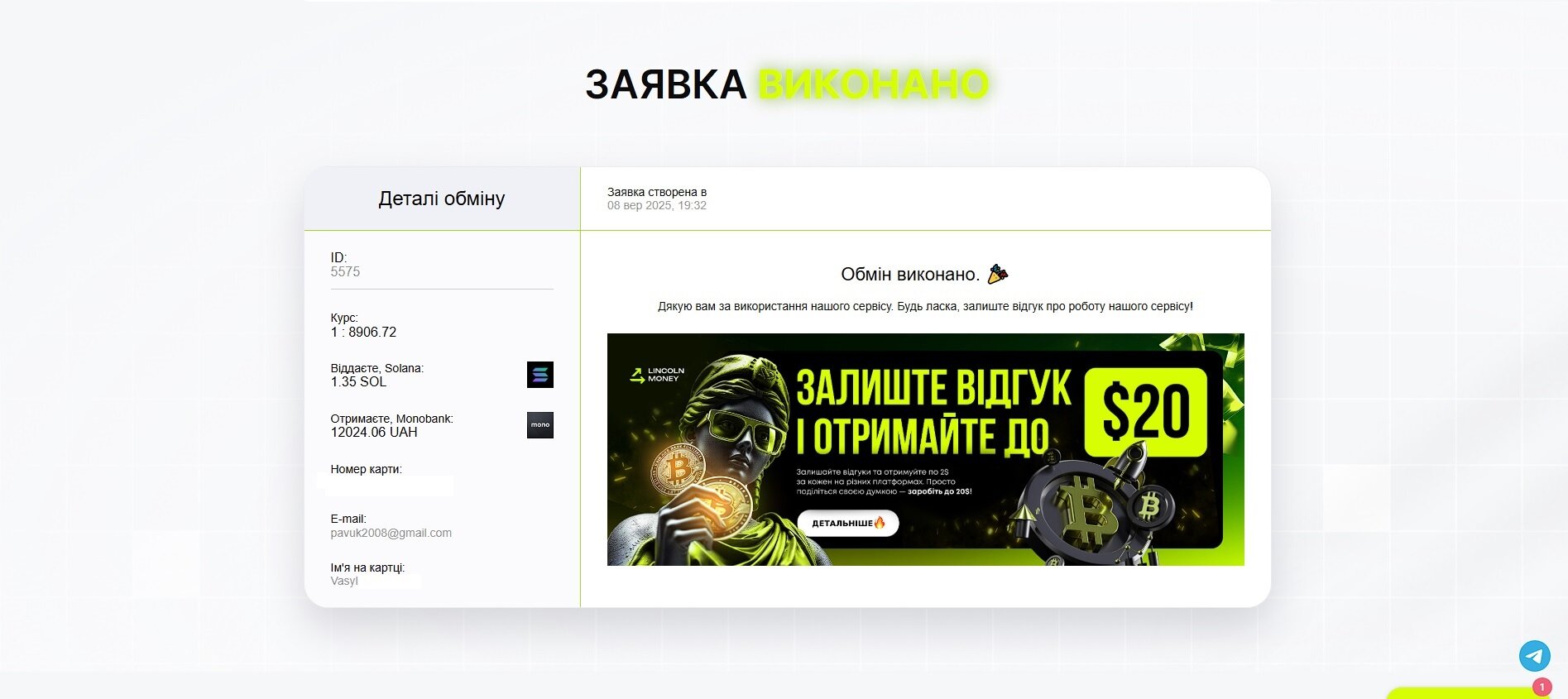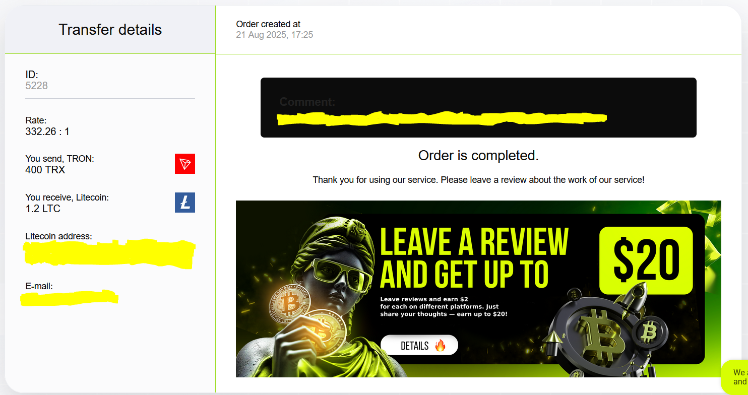 Гість Елена Опубліковано 24 серпня, 2025 Опубліковано 24 серпня, 2025 Обмен USDT на Моно UA. Всё прошло легко и без проблем, деньги пришли через 28 минут после создания заявки. Довольна сервисом, рекомендую. ID: 5275 Цитата