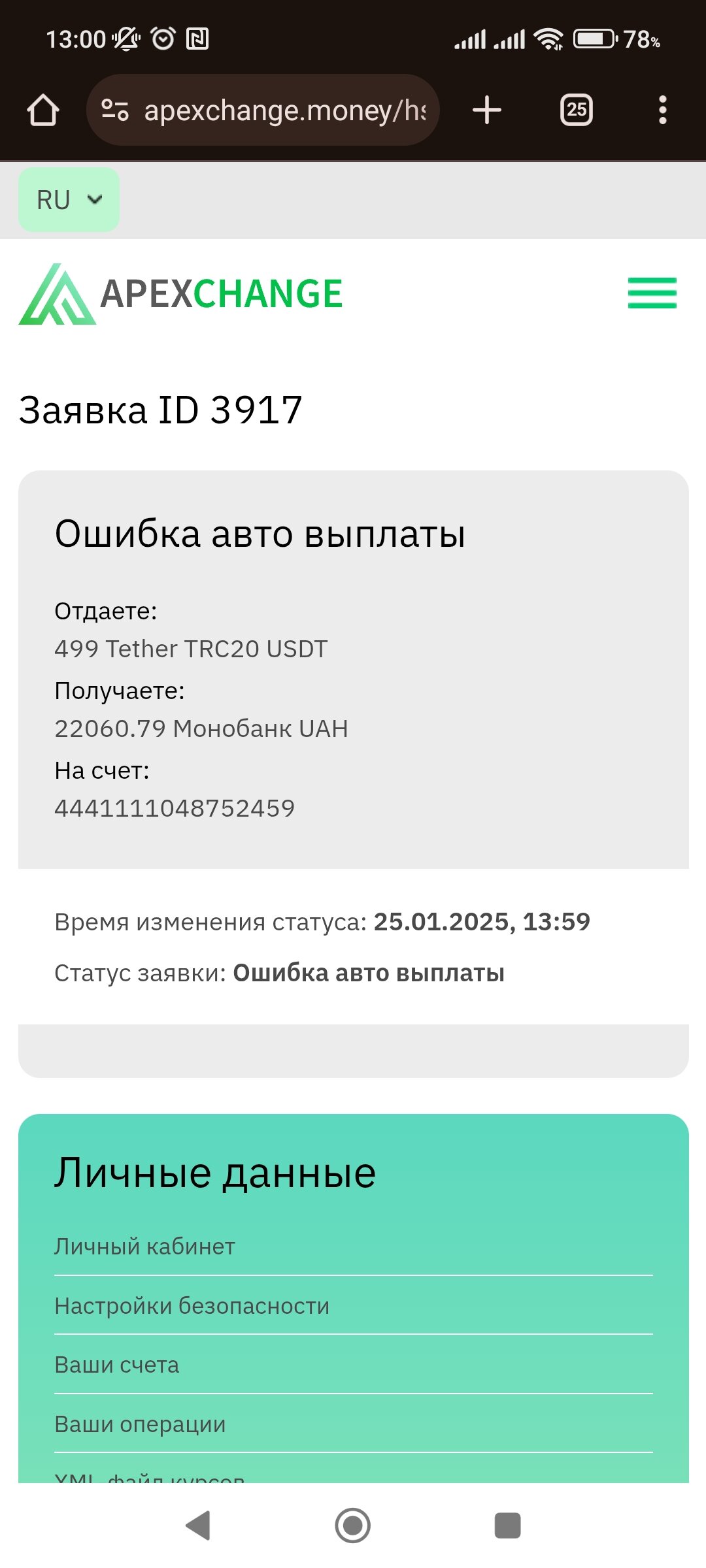Гість Валерій Опубліковано 25 січня, 2025 Опубліковано 25 січня, 2025 Заявка ID 3917 Сделал перевод на присланный кошелек 499 usdt, платеж был принят, о чем сообщила система на сайте обменника. Сразу же выбило после этого - ошибка авто выплаты Прошло больше 2 часов, средства на карту так и не поступили, отправил 2 раза письмо через раздел контакты и заполнение формы, ответ так и не последовал. Цитата