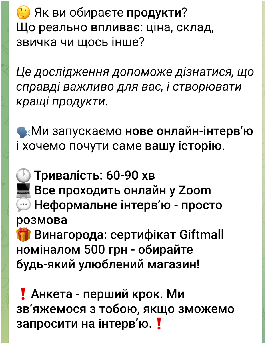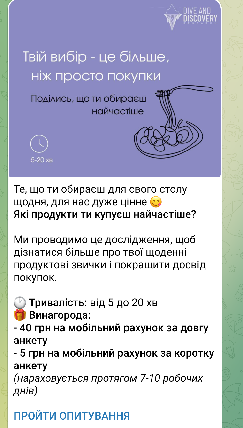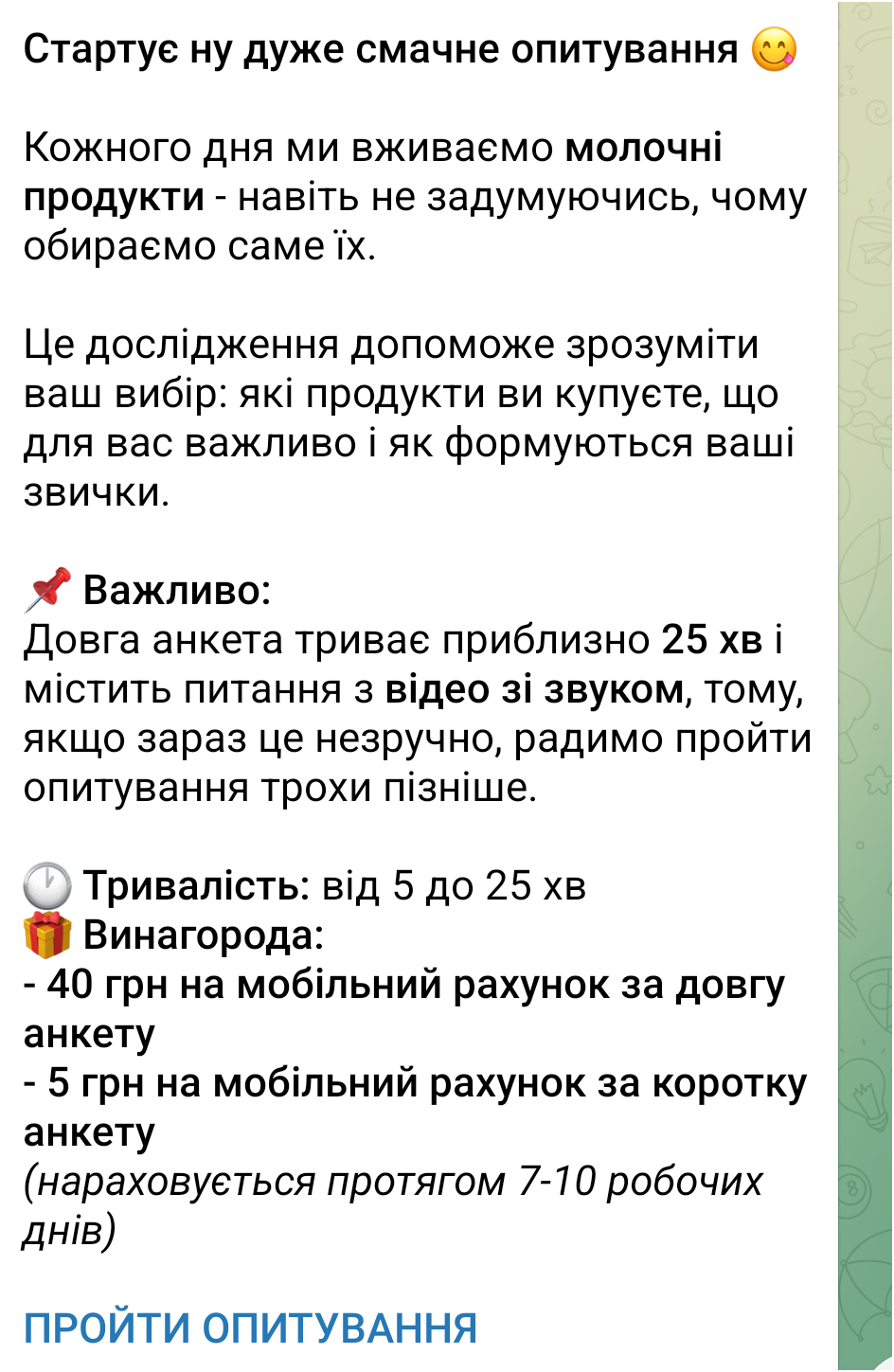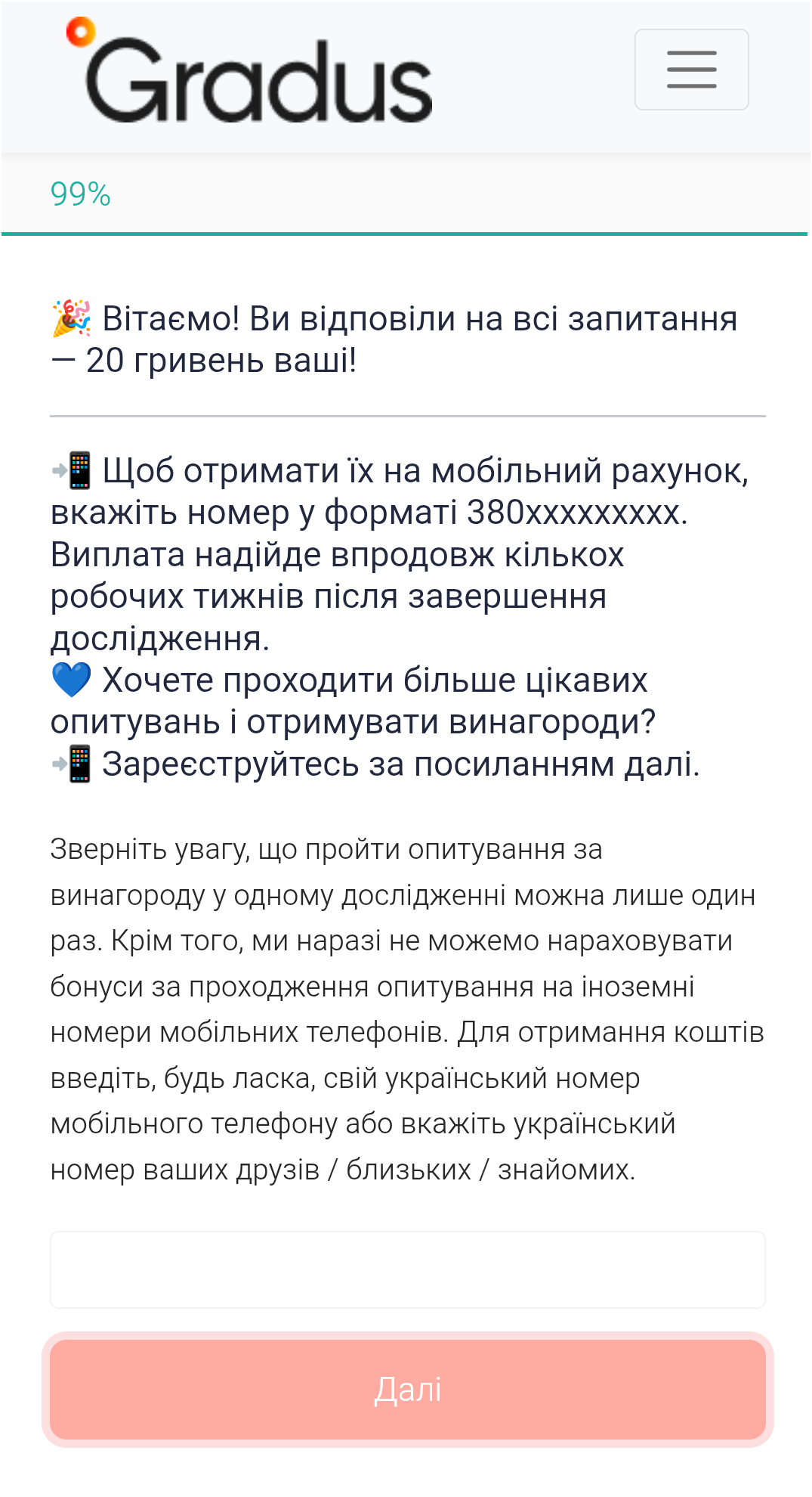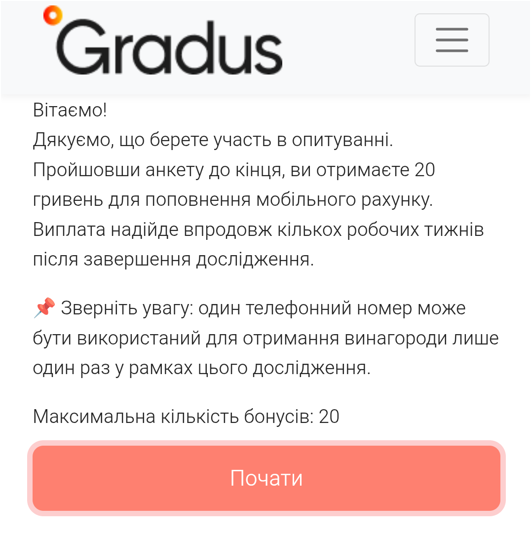 Опросы от Gradus. Компания занимается проведением соц опросов, за каждый опрос платит 20 грн на мобильный телефон. Возможно кому-то будет интересно. Из последних: https://web2.gradus.app/survey/experience1324 Для прохождения надо выбрать что вы ВПО и переехали из Донецкой области во Львовскую область, дальше можно клацать все подряд не читая. Если захотите выбрать что-то другое (не ВПО из Донецкой области во Львовскую), то вас скорее всего выкинет и скажет, что вы нам не подходит. Да, вот так сейчас проводятся соц опросы результаты которых нам потом парят в СМИ) половина людей вообще не читает что отвечает.) В конце указывает номер телефона куда они пришлют 20 грн. Деньги приходят не сразу, а через время.