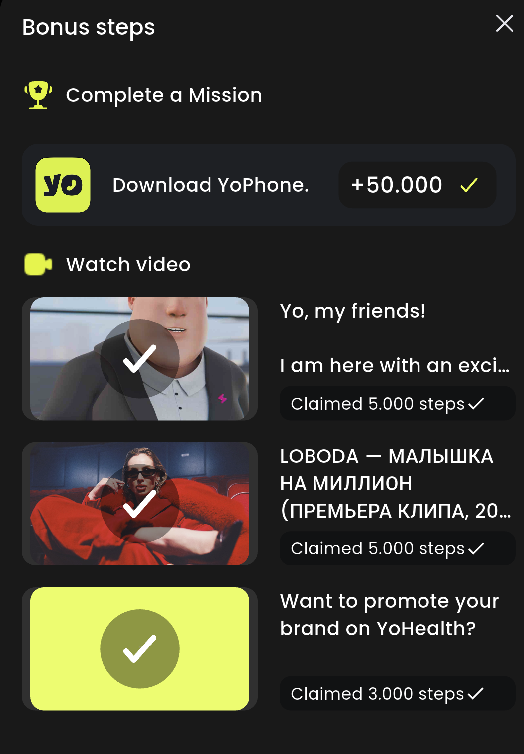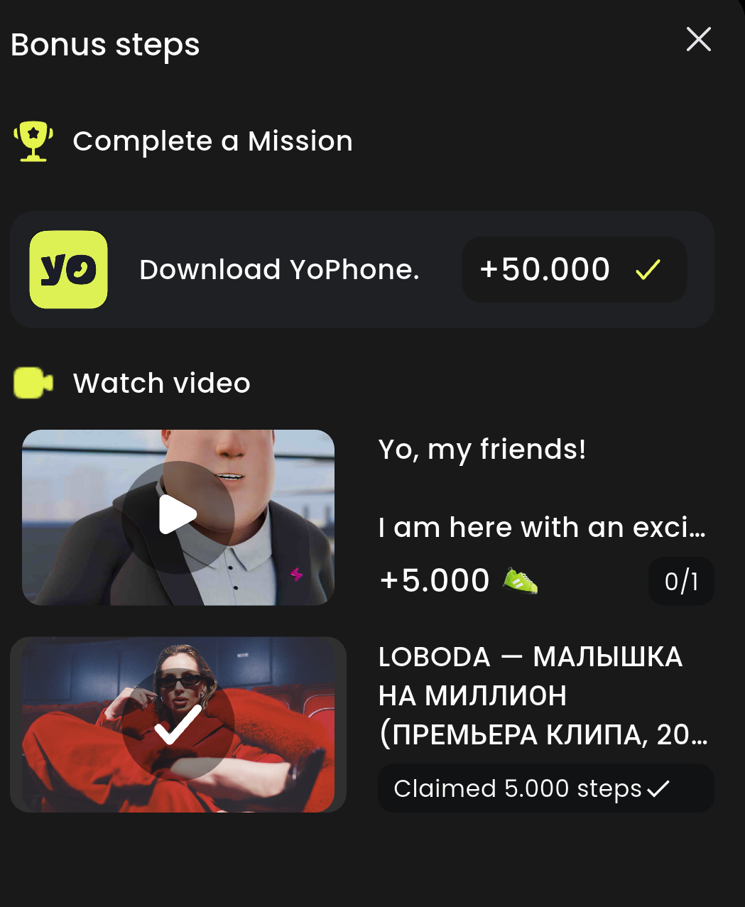 По бонусам. 1. 50 тысяч шагов, если вы сможете это их глючное приложение Yophone авторизировать по номеру телефона, как ранее писал только с 17:20 до 17:30 пытаться получить смс. Потом та за просмотр видео можно получить. Но мне только за Лобаду дало. 2. И серия бонусов за шаги: +5к в день если находите или накрутите 20к шагов в день. +10к в неделю если наберёте за неделю 140к шагов +50к если за месяц наберёте 600к шагов.
