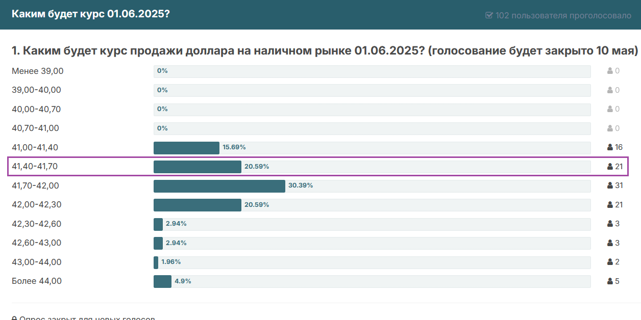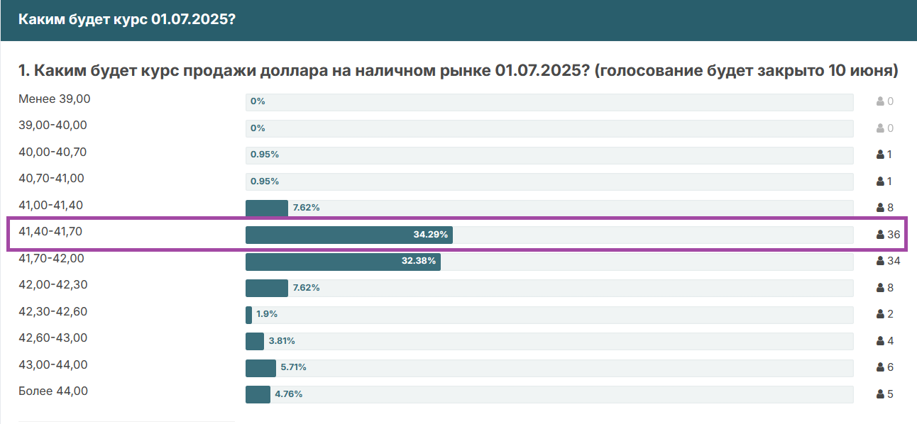 Результаты голосования на 01.06.2025. Сегодня открыто новое голосование: «Каким будет курс продажи доллара на наличном рынке 01.07.2025?». Голосование открытое, результаты видны всем. Свои прогнозы, пожалуйста, отписываем в комментариях. Для объективности результатов, голосование будет автоматически закрыто 10 июня.