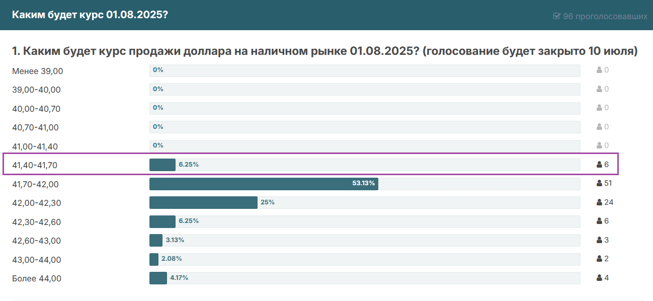 Результаты голосования на 01.07.2025. Сегодня открыто новое голосование: «Каким будет курс продажи доллара на наличном рынке 01.08.2025?». Голосование открытое, результаты видны всем. Свои прогнозы, пожалуйста, отписываем в комментариях. Для объективности результатов, голосование будет автоматически закрыто 10 июля.