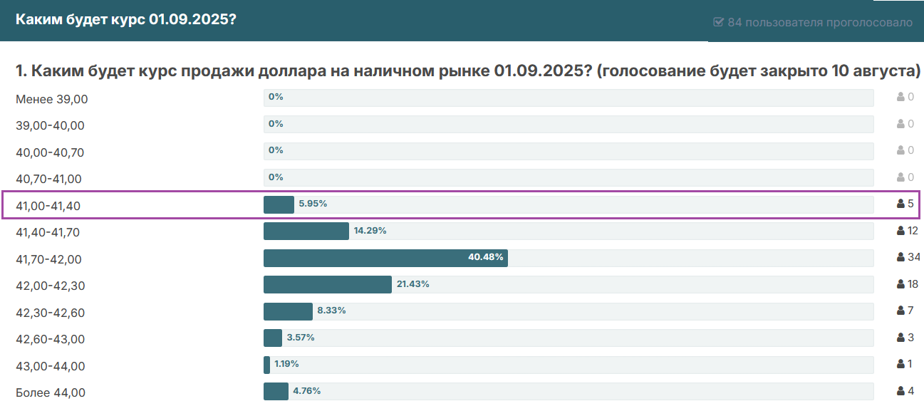 Результаты голосования на 01.08.2025. Сегодня открыто новое голосование: «Каким будет курс продажи доллара на наличном рынке 01.09.2025?». Голосование открытое, результаты видны всем.