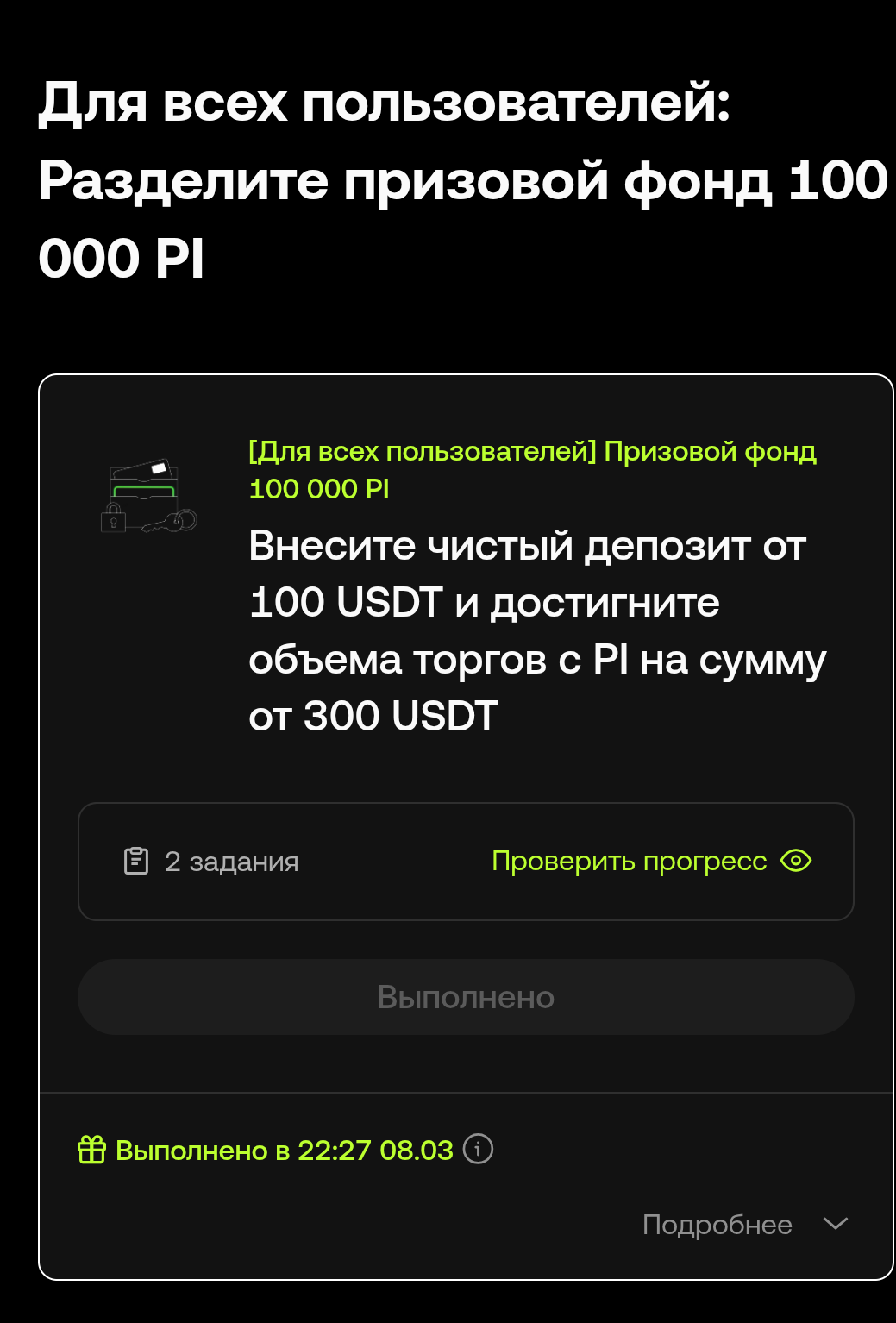 Сегодня последний день промки по PI, доход там не очень большой планируется, ну может кто хочет сделать (105 завести и оборот 300 для старичков). 100ку держать до завтра и можно выводить. Промку ищите в центре компаний.