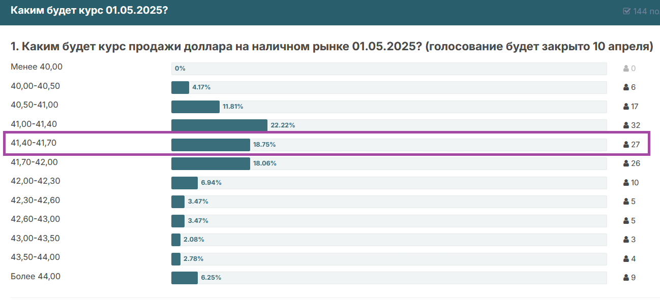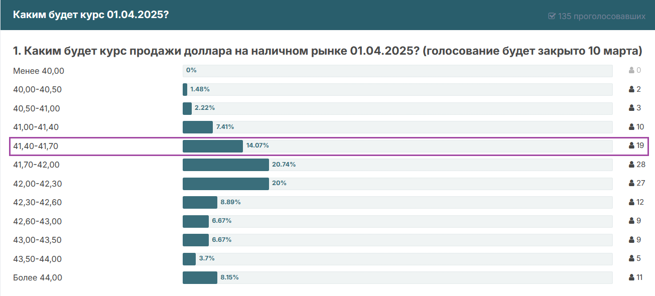 Результаты голосования на 01.03.2025. Сегодня открыто новое голосование: «Каким будет курс продажи доллара на наличном рынке 01.05.2025?». Голосование открытое, результаты видны всем. Свои прогнозы, пожалуйста, отписываем в комментариях. Для объективности результатов, голосование будет автоматически закрыто 10 апреля.