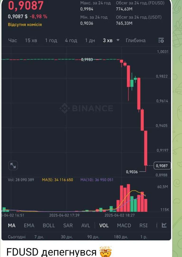 Один из стейблов, который тесно связан с биржей бинанс потерял привязку к доллару... Джастін Сан заявив що First Digital Trust неплатоспроможні, через що стейблкоїн який повинен бути 1/1 втратив прив'язку до долара💸