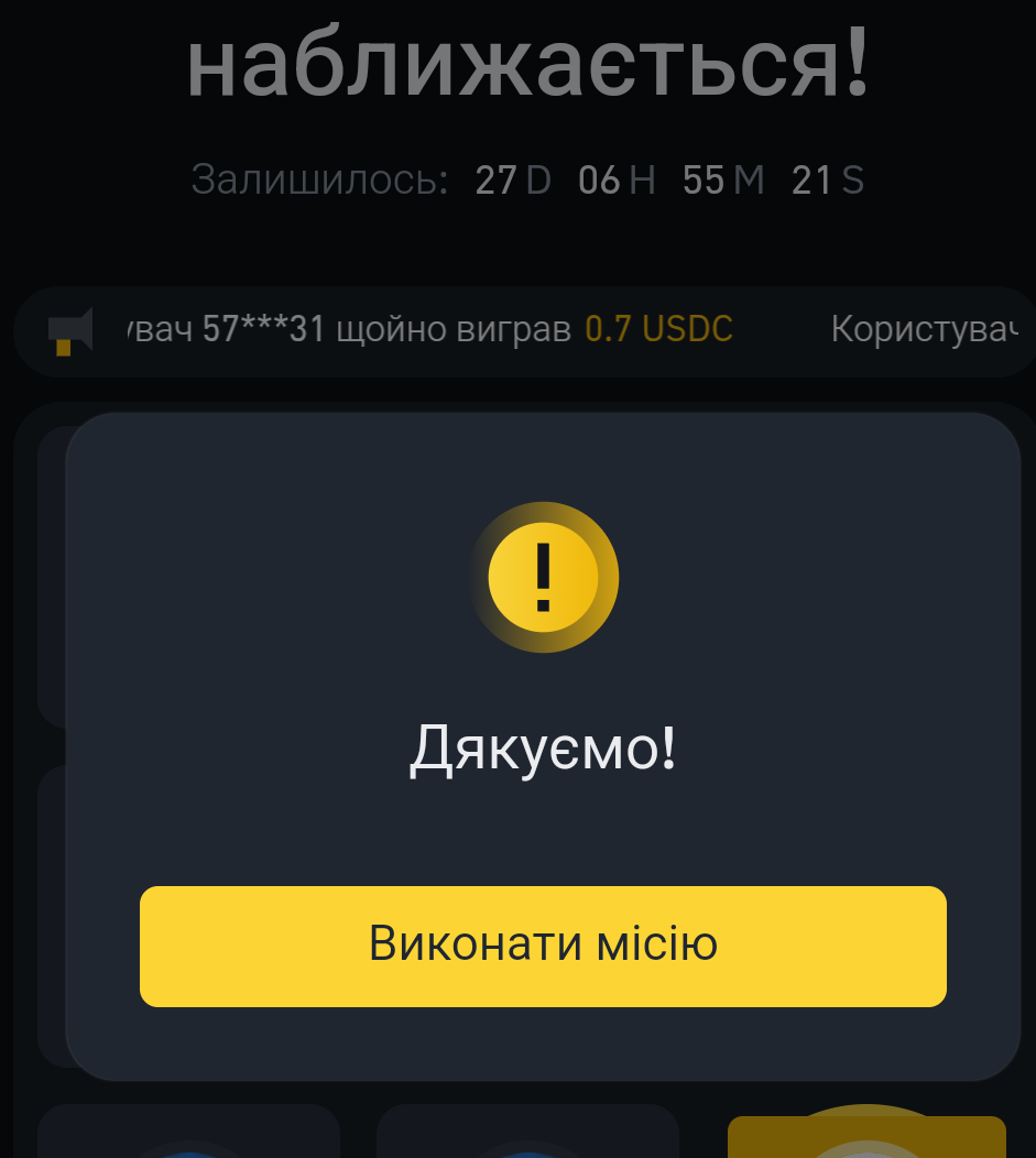 ❄️ Снігопад USDC наближається! Розділіть 15 000 USDC, виконуючи прості завдання! 🗓Період промоакції: до 10.02.2025 включно Що потрібно робити? ➡️Виконуйте щоденні завдання, отримуйте спроби активності та перевірте свою вдачу! Які завдання? ➡️Від запрошення друга до здійснення торгової угоди на Binance! 👀 Максимальна винагорода для 1 учасника - 300 USDC! 🔗 Зареєструватися ТУТ https://app.binance.com/uk-UA/activity/challenge-competition/BN11084016270755382593?_dp=L3dlYnZpZXcvd2Vidmlldz90eXBlPWRlZmF1bHQmdXJsPWFIUjBjSE02THk5M2QzY3VZbWx1WVc1alpTNWpiMjB2ZFdzdFZVRXZZV04wYVhacGRIa3ZZMmhoYkd4bGJtZGxMV052YlhCbGRHbDBhVzl1TDBKT01URXdPRFF3TVRZeU56QTNOVFV6T0RJMU9UTQ 🔗 Деталі ТУТ https://www.binance.com/uk-UA/blog/all/94281764820537196?hl=uk-UA