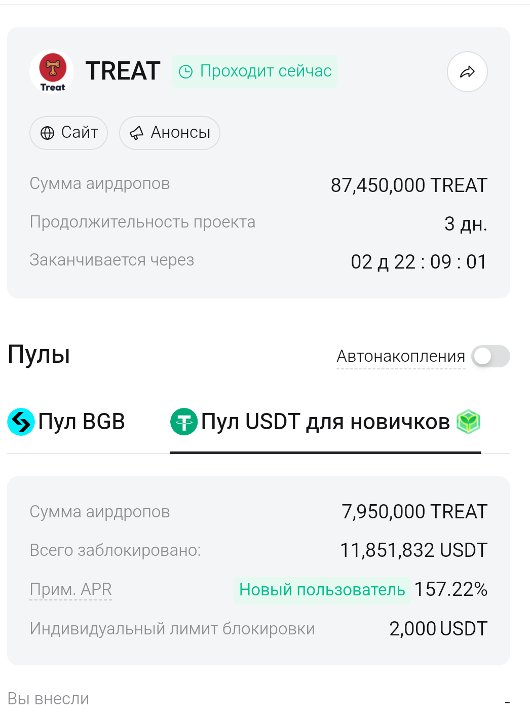 На битгет сейчас пул под 150% на 3 дня в usdt, только для новичков. В bgb для всех, но там не так интересно...