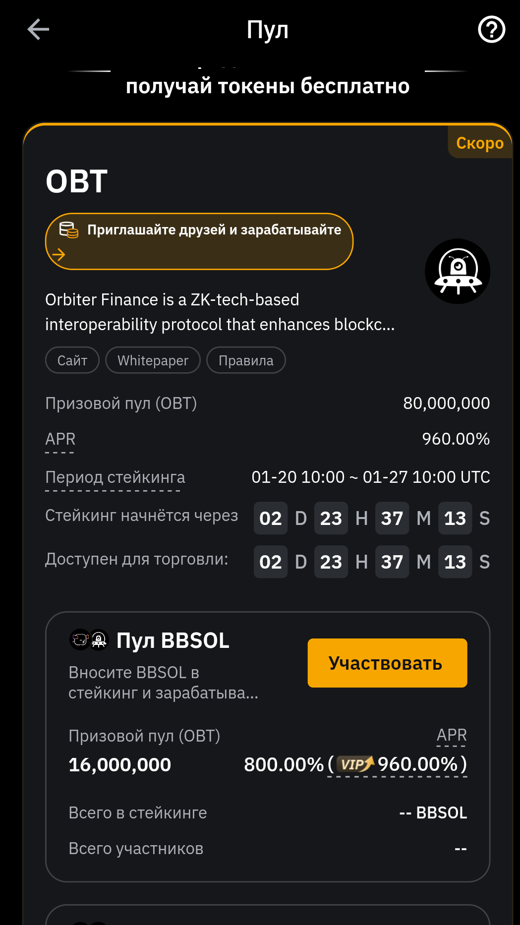 Сейчас хорошая акция по solv есть на веб3 бинанс, но там не для новичков, могут сделать только те кто в этом разбирается. Надо около 13 usdt и умение работы с веб3, биржей, сетями... Инструкция на англ. https://docs.solv.finance/user-guide/stake-btcb-in-binance-megadrop