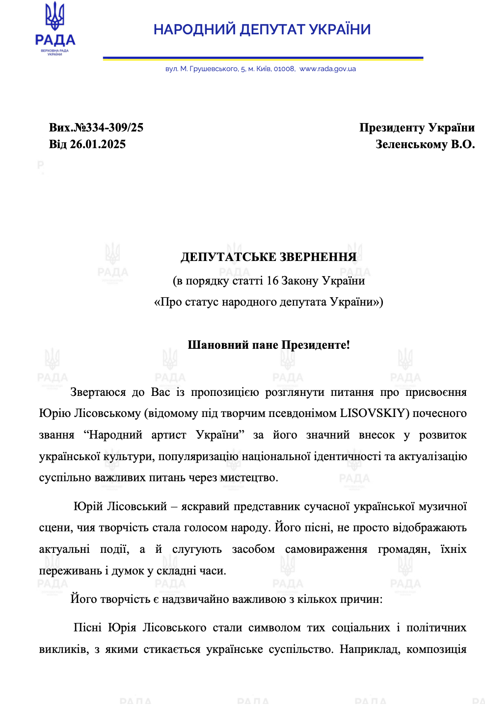 Пісні Юрія Лісовського стали символом тих соціальних і політичних викликів, з якими стикається українське суспільство. Наприклад, композиція“ТЦКашник” сатирично осмислює питання мобілізації, бюрократичних процедур та ставлення до громадян. Це мистецьке висловлювання викликає резонанс у суспільстві, об’єднує громадян навколо важливих тем і сприяє їхньому осмисленню. Пісні, такі як «Бо не втік» та «П****у», відображають думки, переживання та позицію українського народу щодо актуальних подій і ставлення до представників влади. Зокрема, пісня «Бо не втік» передає чітке та точне ставлення громадян до поведінки Президента України та його позиції у суспільстві Дмитрук решил потроллить зеленского... 🤣