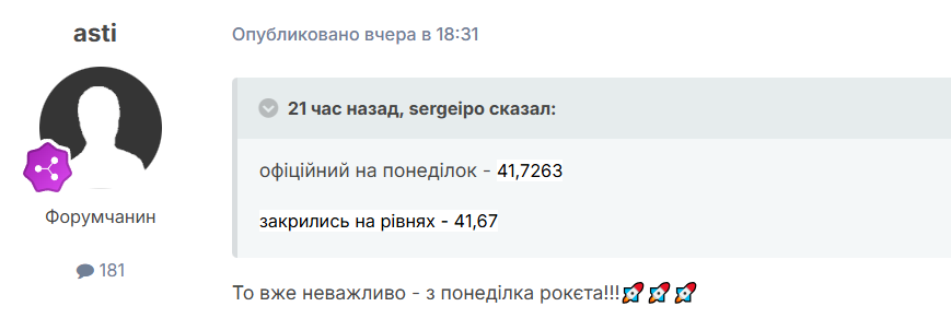 Судячи з двох ваших повідомлень з понеділка рокєта до 42,00? Чм ви сьогодні перевзілися? Відкупили свої ОВДП вже?
