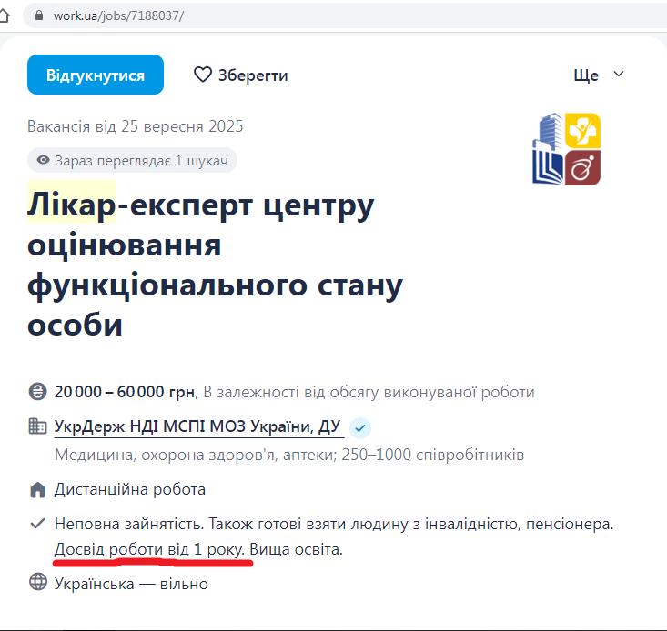 17. оживлю трохи топік) ЦОФСО (дивись малюнок) шукає працівників. Сюди пишуть (пацієнти та іх адвокати) щодо оскарження рішень експертної комісії з оцінювання повсякденного функціонування (раніше МСЕК) про непризначення групи інвалідності або призначення не тієї. Скарги розглядють експерти центру оцінювання, більшість яких - поважні фахівці, але можуть бути і такі (підкреслено червоним). Зарплата у професора і експерта "зі стажем роботи від одного року" може бути однаковою і залежати від кількості розглянутих справ П.С. бережіть здоров'я, в т.ч. ментальне. Хворіти - дорого.