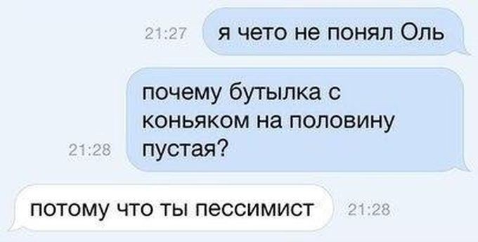 Девушку, которая встречается с шестью парнями одновременно, во дворе называют торрент. *** Ох уж эти наши дороги - сел за руль и поскакал! *** Врач-пессимист просто не поехал на вызов. *** Пришла домой с работы - на столе записка: "Я у бабы!" Сын или муж? Радоваться или огорчаться? *** Однажды какая-то глупая, бестолковая обезьяна так и не сумела научиться лазить по деревьям... Так началась история человечества. *** Бывший жонглер, поставленный на разлив, чуть не довел до инфаркта своих собутыльников.