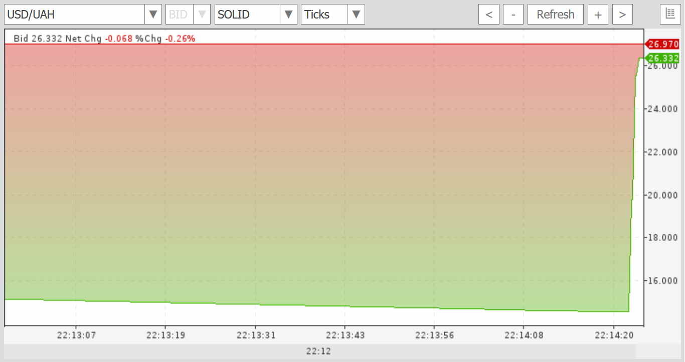 Объяснить не могу, вероятно какой-то глюк на графике ProFinance . Курс покупки дошёл до 15 грн/$, сейчас уже вернулся к норме: