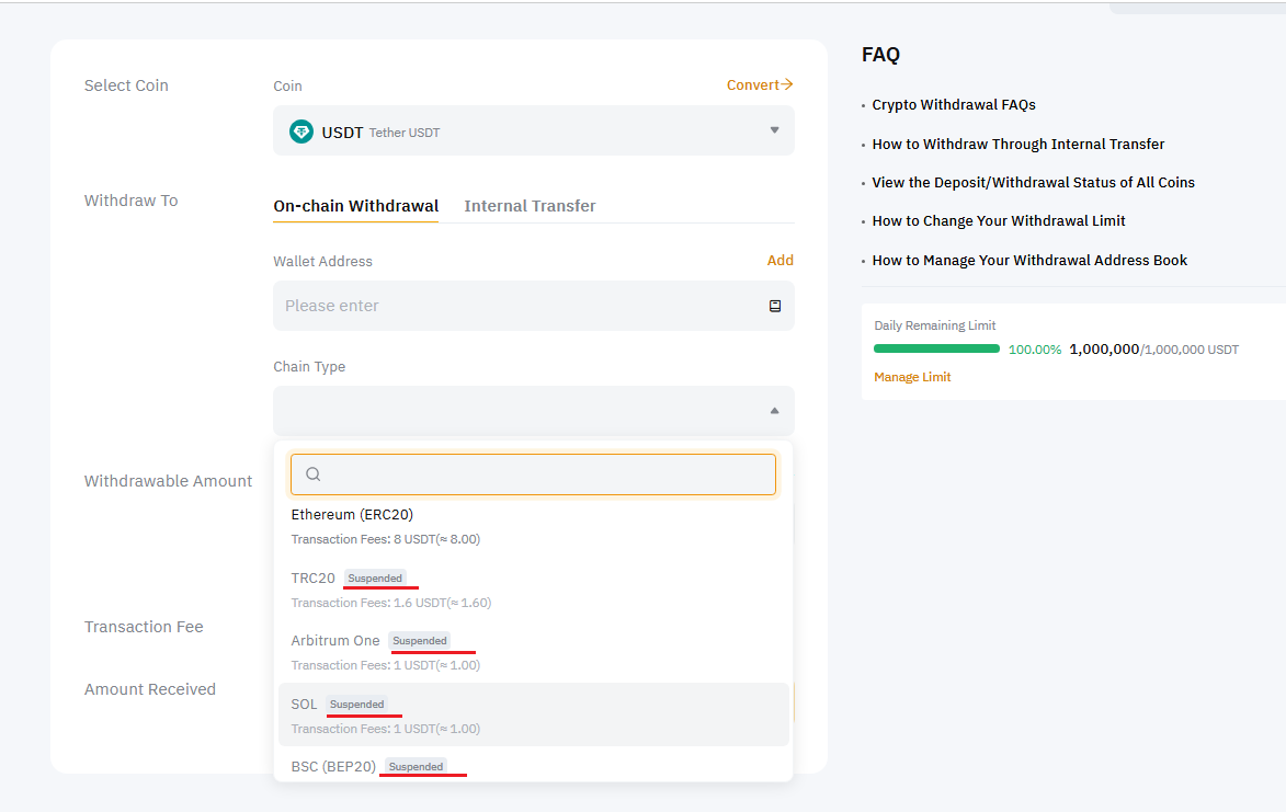2. Выводы многих криптовалют с биржи ByBit приостановлены. Вот как, в частности, обстоит дело с выводом тезера: Из всех доступных вариантов открыт только вывод через ERC20 за 8USDT. Биржа явно пытается подзаработать на паникерах.