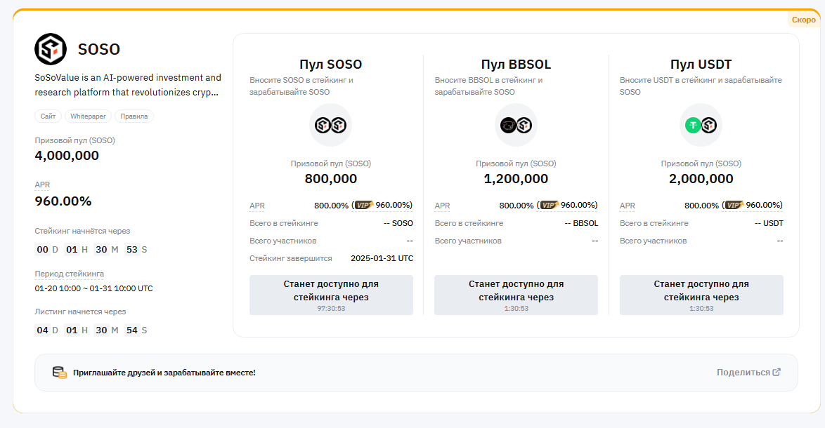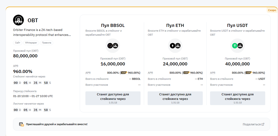 Для информации: вышел из стейкинга OBT (на ByBit). Не вижу перспектив. 300USDT закинул на фиксированный на 3 дня (там 555% дают, но только на 300), остальное добавил в стейкинг SOSO. Посмотрим, что будет на старте. Если такая же фигня, как тут, то и оттуда выйду.