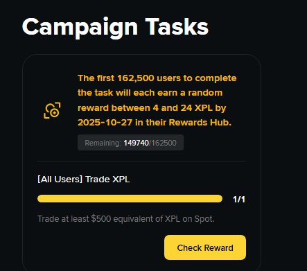 Участвуем в промке: https://www.binance.com/en/activity/trading-competition/spot-XPL-listing-campaign Купить-продать XPL на 255$. Приз для 162 500 участников (это ОВЕРДОФИГА). Лучше делать мгновенными (рыночными) ордерами на всю сумму. Купить на 255$ и сразу же продать. Вот так должно получиться: P.S. Напишите, кто-то пользуется? Это реально легкий заработок...
