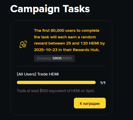 Участвуем в промке: https://www.binance.com/ru-UA/activity/trading-competition/spot-hemi-listing-campaign Купить-продать HEMI на 255$. Приз для первых 60 000 участников. Лучше делать мгновенными (рыночными) ордерами на всю сумму. Купить на 255$ и сразу же продать. Вот так должно получиться: