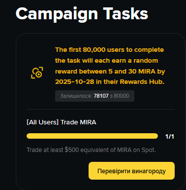 Участвуем в промке: https://www.binance.com/uk-UA/activity/trading-competition/spot-mira-listing-campaign Купить-продать MIRA на 255$. Приз для 80 000 участников (это довольно много, успеете принять участие). Лучше делать мгновенными (рыночными) ордерами на всю сумму. Купить на 255$ и сразу же продать. Вот так должно получиться: