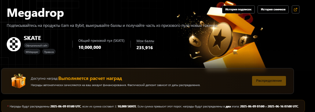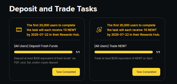Промка на BINANCE: 1. Завести свежий депозит от 200USDT 2. Сделать оборот от 200USDT на споте - купить/продать монету NEWT за USDT. Все делать быстро. Первым 20 000 участников начислят по 30NEWT. По текущему курсу это около 20$, ну, пока придут, возможно, будет меньше. Ссылка для регистрации в акции: https://www.binance.com/en/activity/trading-competition/spot-newt-listing-campaign Вот так в итоге должно отображаться: