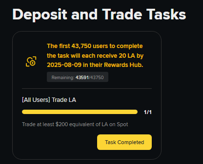 Акция на Binance: https://www.binance.com/en/activity/trading-competition/spot-la-listing-campaign Задание - купить-продать LA на эквивалент 200USDT. Первым 43750 участникам начислят по 20LA (около 9USDT). Делается за 1 минуту, вот мой результат: Как видим, мест еще достаточно. Но не затягивайте.