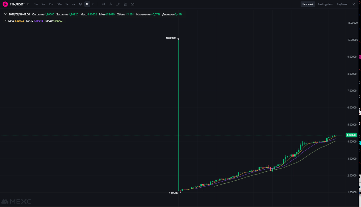 19. Цікава монетка ця FTN. Глянув, заради цікавості, на графік FTN/USDT на тому ж MEXC. З моменту створення вона тільки росте: Свічка у момент лістингу - не рахується. А монетці, на хвилиночку, - вже 1,5 роки...