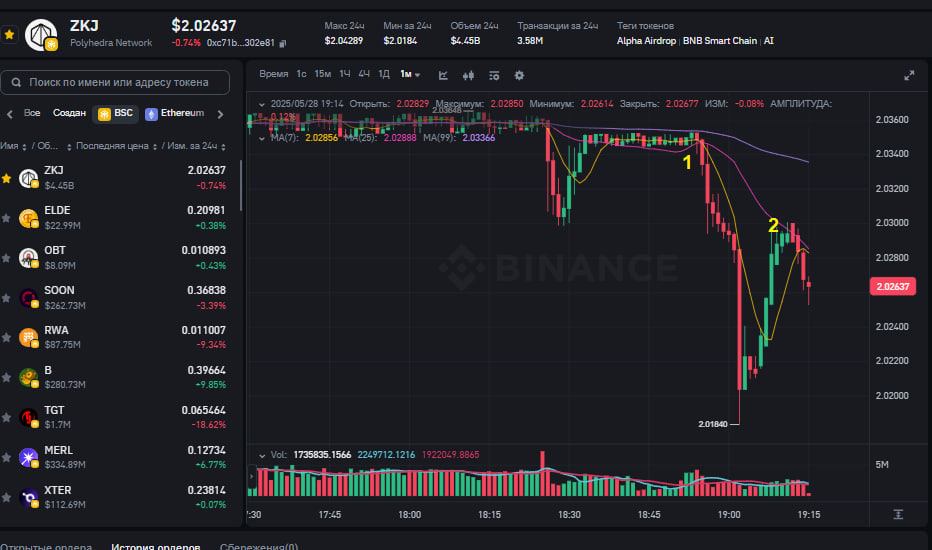 8. Для тех, кто крутит альфа-баллы на монете ZKJ. Поделюсь вчерашним событием. Вечером оставалось мне докрутить 2 оборота, вроде флэт, купил я ZKJ - и тут... смотрите сами: В точке 1 я купил :) Потом был полет вниз и мысли "Сейчас в ноль обвалится, будет очень обидно". Потом пошло вверх, но, как видите, не вернулось к исходному уровню. В общем, в точке 2 я продал. Так что... так тоже бывает...