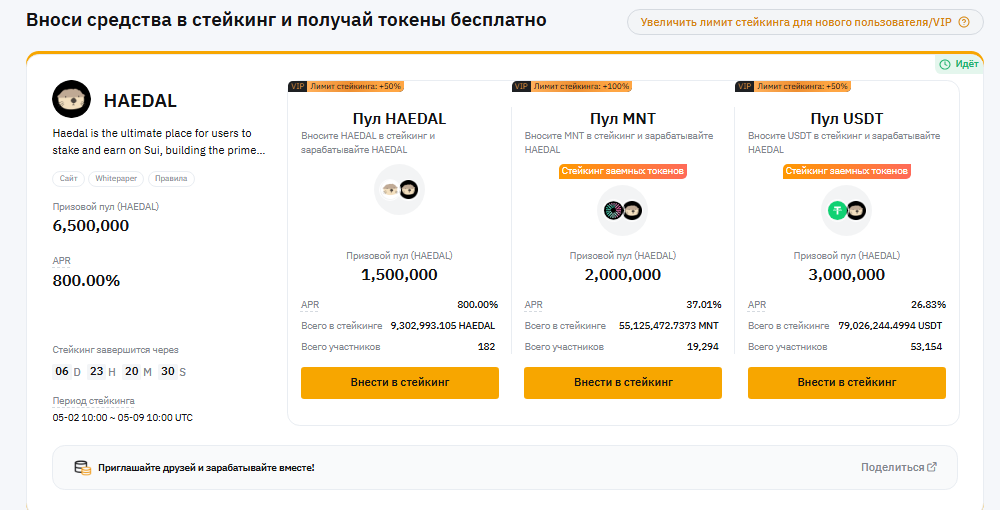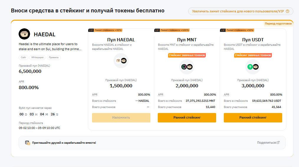 Через 3 часа, а именно в 13:00 по Киеву на ByBit очередной лаунчпул по монете HAEDAL: Предыдущий пул по ZORA был довольно неплохим, монета "сдулась" только в последние 2 дня. Но здесь... честно говоря, я начинаю сомневаться: очень много набилось желающих и много внесли в ранний стейкинг еще до начала. С другой стороны, особо выбирать не из чего, поэтому, скорее всего, воспользуюсь.