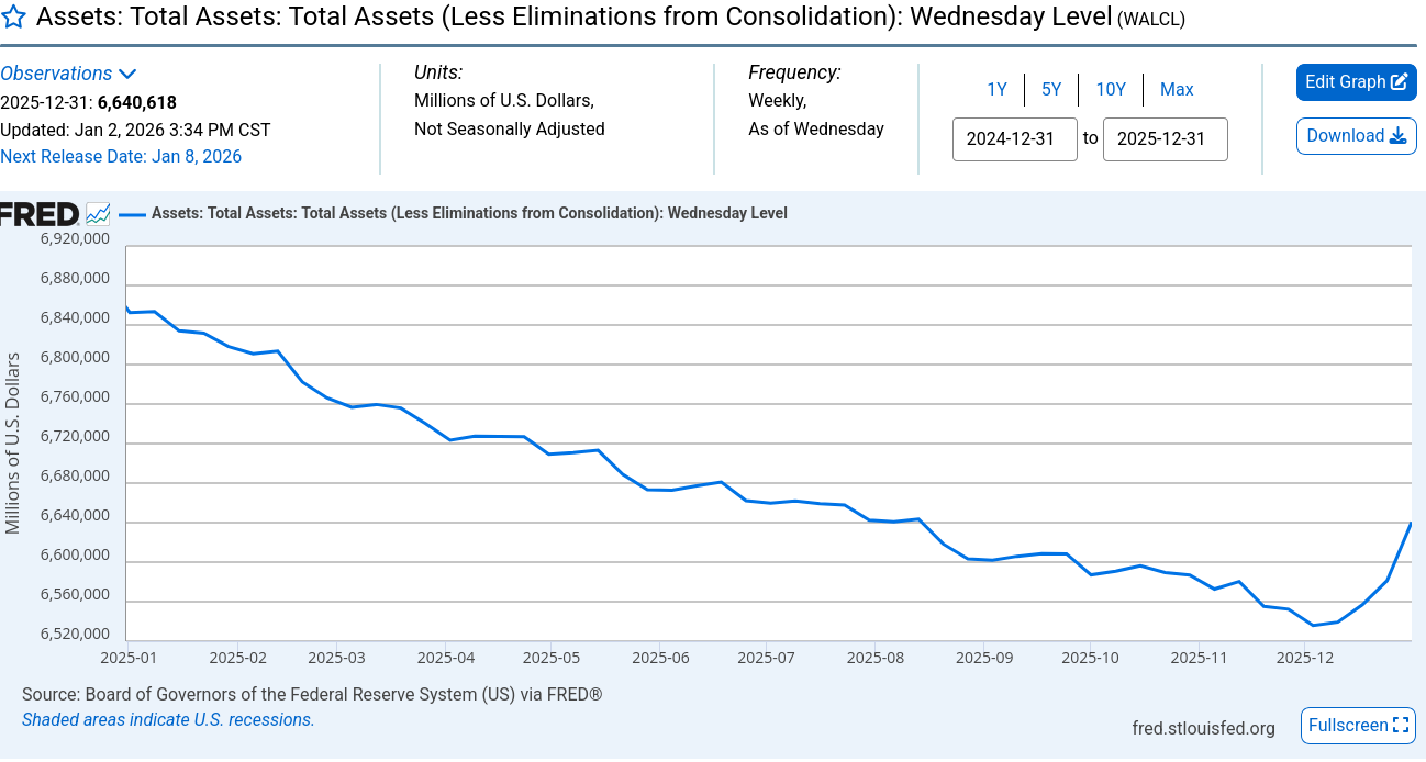 За декабрь 2025 года баланс ФРС увеличился почти на 105 млрд. долл.: https://fred.stlouisfed.org/series/WALCL