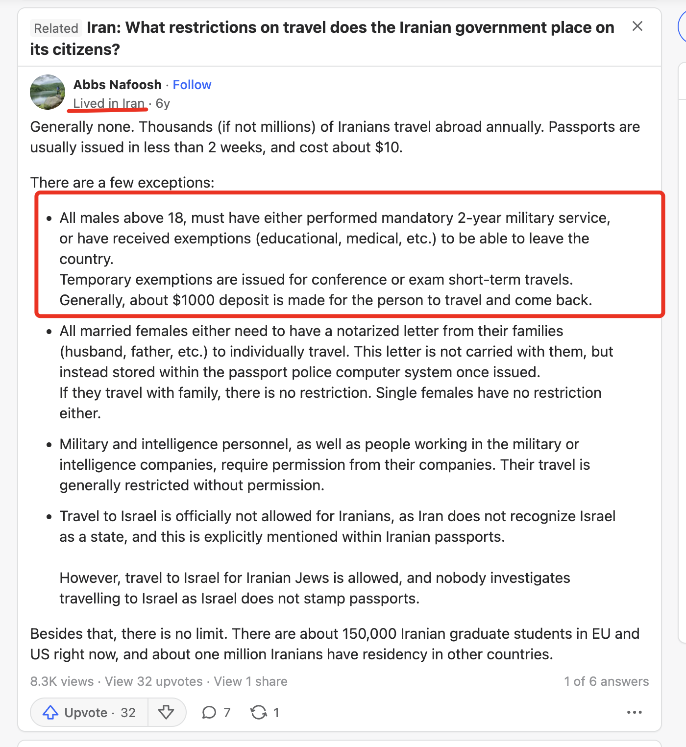 чего ж ты не говоришь, что нужно всего лишь 2 года отслужить и свободен. обычная армия. 2 года красишь траву в безопасности и ты свободен. то есть по факту ограничения только на тех, кто косит, а на десятках миллионах - никаких ограничений. по факту у них как во всех нормальных странах воюют те, кто хотят и кто хочет жить в этой стране. у нас же насильно заставляют идти на смерть тех, кто не хочет иметь ничего общего с этой страной. и главное - народ на этом форуме - але, чего вы ей на слово верите???? ну хоть ии спросите?? как верить в людей, если даже тех, кто на этом форуме можно так легко облапошить? до свидания